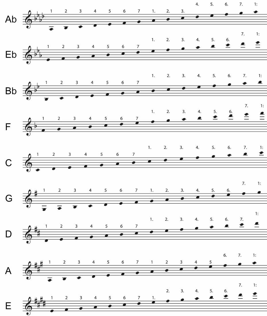 - Suche dir aus dem oben abgebildeten Tonleiter-Blatt die Zeile mit der richtigen Tonart.