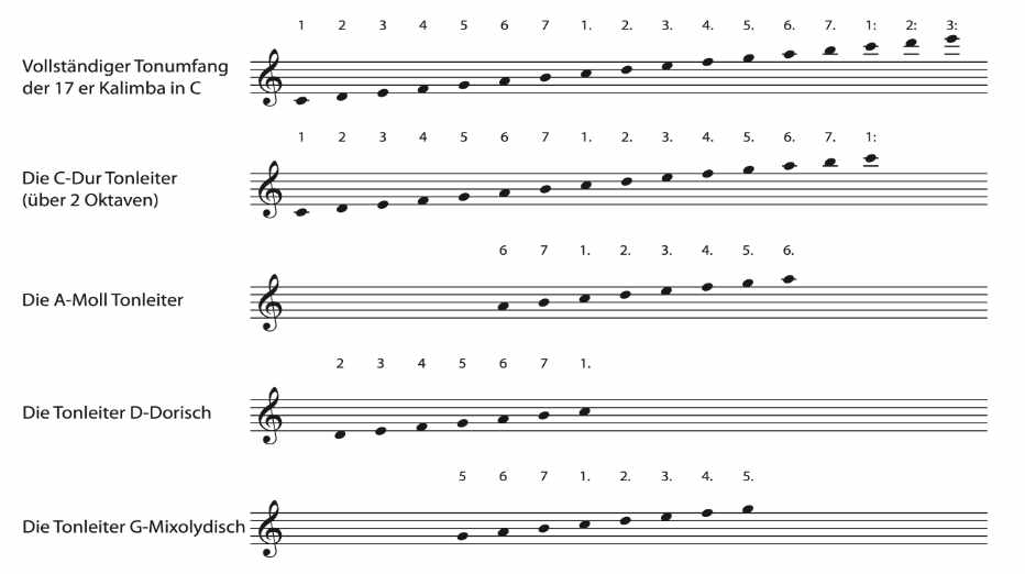 Du kannst auf einer Kalimba nur das Tonmaterial der eingestimmten Tonart verwenden. Eine Kalimba, die in C-Dur gestimmt ist, kann nur das Tonmaterial der C-Dur-Tonleiter spielen- also die C-Dur-Tonleiter selbst sowie die parallele Moll-Tonleiter A-Moll (äolisch) und die Kirchentonleitern, die auf dem Tonmaterial von C-Dur basieren. Die wichtigsten Kirchentonleitern sind D-Dorisch und G-Mixolydisch. Dieser Umstand bedeutet aber nicht, dass du nur Stücke spielen kannst, deren Noten in C-Dur abgedruckt sind. Diatonische Musik aus anderen Tonarten lässt sich leicht in die Zieltonart deiner Kalimba transponieren.